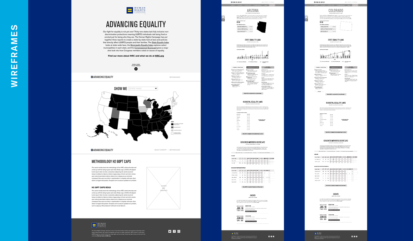 In November of 2019, I took a UX design course at General Assembly and used my class project to rethink how the HRC website presents the multiple Equality Index reports HRC produces every year. Specifically, I focused on the State Equality Index (SEI), Municipal Equality Index (MEI), and their Congressional Scorecard. These three reports can give someone a macro and micro view of where a state stands on LGBTQ inclusive legislation.